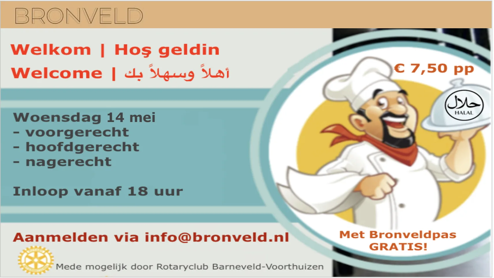 Zonder pas betaal je slechts € 7,50 per persoon voor dit heerlijke 3-gangendiner. Dit is mogelijk door een prachtige gift van de RotaryClub Barneveld – Voorthuizen en de vele vrijwilligers, die koken, tafels klaarmaken, het eten naar de tafels brengen, afruimen en afwassen.
