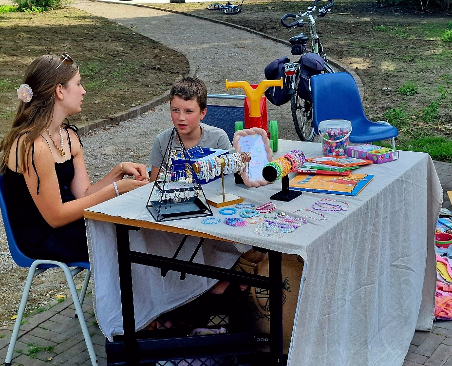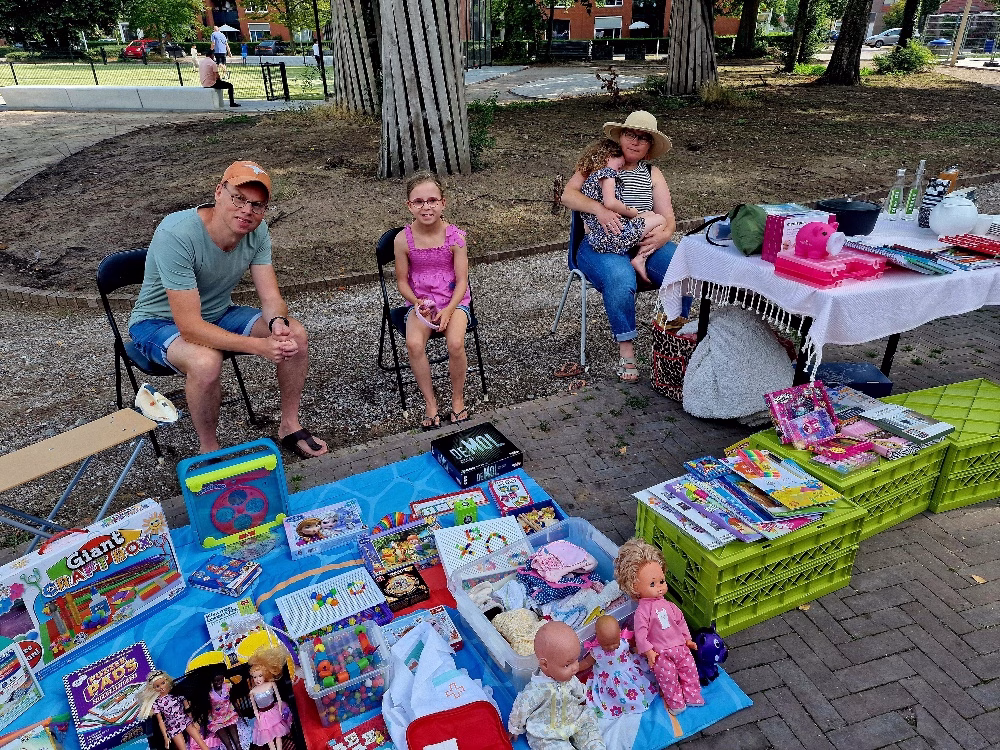 Wat een geweldig feest was de eerste Zomermarkt bij het nieuwe buurthuis Bronveld vandaag (zaterdag 19 juli 2025). Het weer was tot een uur of één prima. Daarna werd het eigenlijk te warm voor de kinderen en volwassenen om hun waren via kleedjes en tafels te verkopen. En natuurlijk gold dat ook voor de dames die de armen van kinderen die dat graag wilden versierden met allerlei glitters.