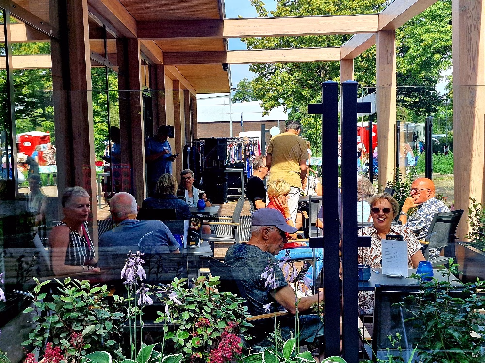 Het was ook de eerste keer dat het terras goed vol kwam en bleef totdat de Zomermarkt werd beëindigd. Tegen betaalbare prijzen werden bordjes met heerlijk knapperige goudgele frites, tosti’s en broodjes geserveerd. Naast natuurlijk frisdranken, bier en wijn. Die laatste twee allemaal 0.0, want buurthuis Bronveld hanteert een strak 0.0 beleid.