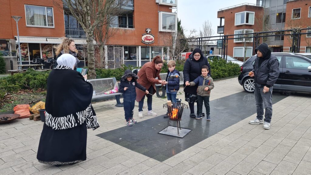 Het werd een prachtig evenement op het Oldenbarneveldplein. Er waren verschillende activiteiten. Stokbroodje bakken, of marshmallows roosteren boven een vuurkorf, oliebollen eten, koffie drinken bij de woningstichting, gezellige ontmoetingen met buurtgenoten, informatie over de vernieuwing van het Oldenbarneveldplein. Kortom een en al gezelligheid! De regen en de wind konden ons niet deren.