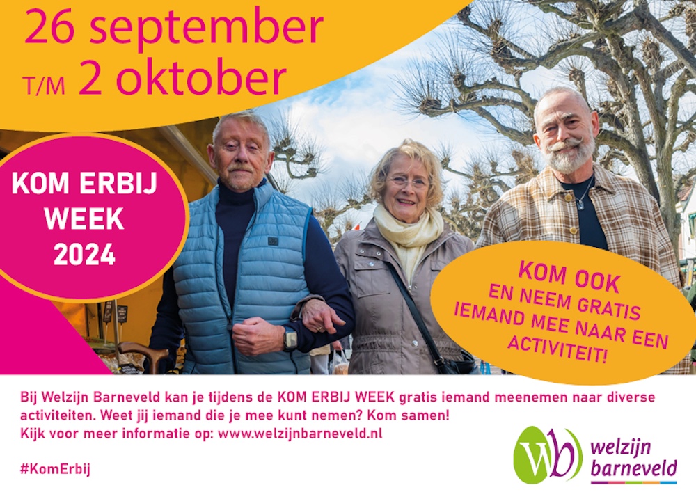 Van donderdag 26 september tot en met woensdag 2 oktober a.s. organiseren Welzijn Barneveld, het CJG, Stichting Connect en de Gemeente Barneveld de zogenaamde ‘Kom Erbij-week’. Deze week staat in het teken van het buurt- en wijkwerk in onze gemeente.
