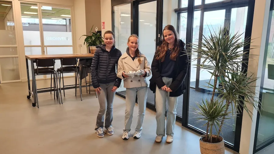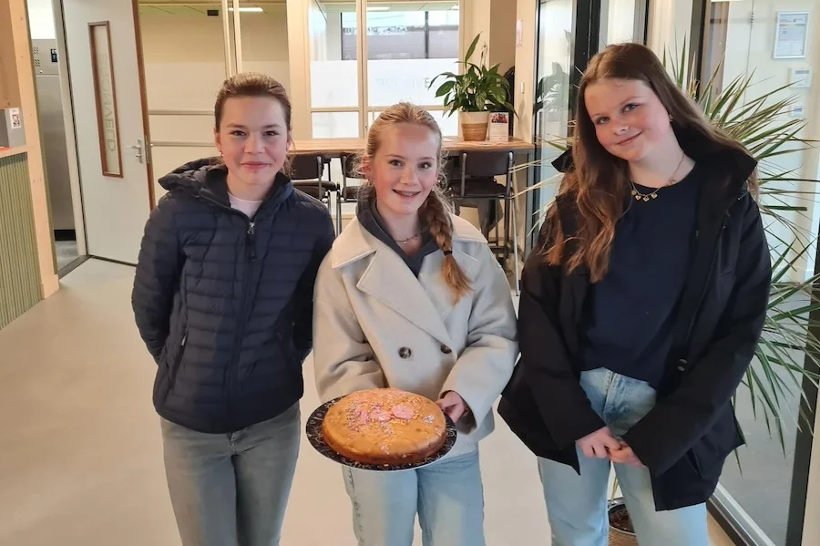 Het is vrijdagmorgen rond 9.25 als drie jonge meiden van het Johannes Fontanus College (JFC) – Charlene, Emma en Meijs – ons buurthuis binnenstappen. Omdat de school 100 jaar bestaat, zijn er in Barneveld meer leuke dingen gedaan, maar wat deze drie meiden komen doen, vinden onze vrijwilligers wel heel leuk: de meiden komen namelijk een overheerlijke zelfgebakken taart brengen. Elin heeft ook meegeholpen bij het bakken, maar helaas kan zij er vanmorgen niet bij zijn.