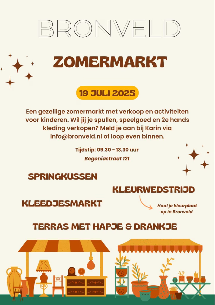 Van 18 juli tot en met 31 augustus organiseert buurthuis Bronveld allerlei activiteiten in het kader van een uitgebreid Zomerprogramma. Op 18 juli is de start met een bordspellen avond met leuke en ook enkele soms nog voor de meeste mensen onbekende bordspellen. Op 19 juli is met een Zomermarkt met verkoop en leuke activiteiten voor kinderen.